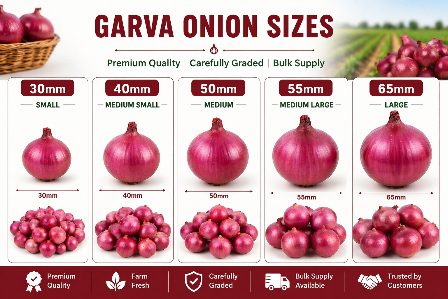 We specialize in supplying high-quality Garva onions (30mm to 65mm) to wholesalers and bulk buyers across India.